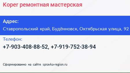 Koper, ремонтная мастерская по адресу Ставропольский край, Будённовск, Октябрьская улица, 92 в дальнейшем Организация, размещена в следующих категориях: