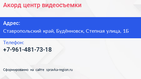 Акорд, центр видеосъемки по адресу Ставропольский край, Будённовск, Степная улица, 1Б в дальнейшем Организация, размещена в следующих категориях:
