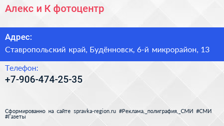 Алекс и К, фотоцентр по адресу Ставропольский край, Будённовск, 6-й микрорайон, 13 в дальнейшем Организация, размещена в следующих категориях: