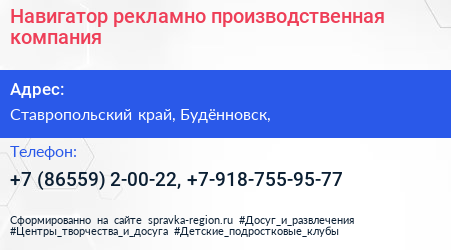 Навигатор, рекламно-производственная компания по адресу Ставропольский край, Будённовск, в дальнейшем Организация, размещена в следующих категориях: