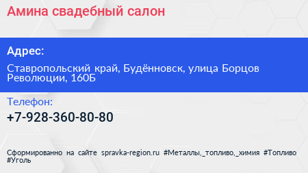 Амина, свадебный салон по адресу Ставропольский край, Будённовск, улица Борцов Революции, 160Б в дальнейшем Организация, размещена в следующих категориях: