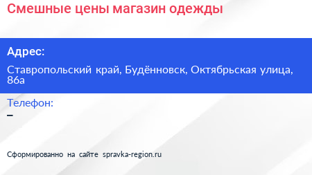 Смешные цены, магазин одежды по адресу Ставропольский край, Будённовск, Октябрьская улица, 86а в дальнейшем Организация, размещена в следующих категориях: