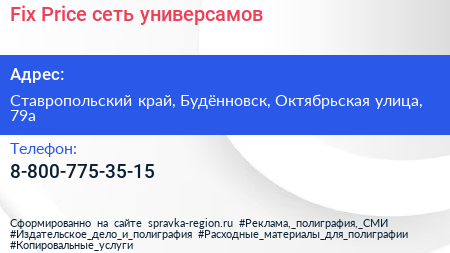 Fix Price, сеть универсамов по адресу Ставропольский край, Будённовск, Октябрьская улица, 79а в дальнейшем Организация, размещена в следующих категориях: