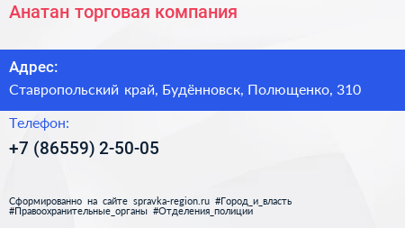 Анатан, торговая компания по адресу Ставропольский край, Будённовск, Полющенко, 310 в дальнейшем Организация, размещена в следующих категориях: