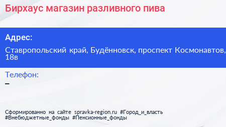Бирхаус, магазин разливного пива по адресу Ставропольский край, Будённовск, проспект Космонавтов, 18в в дальнейшем Организация, размещена в следующих категориях: