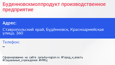 Буденновскмолпродукт, производственное предприятие по адресу Ставропольский край, Будённовск, Красноармейская улица, 360 в дальнейшем Организация, размещена в следующих категориях:
