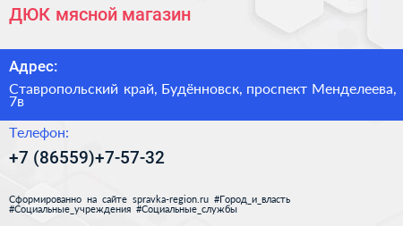 ДЮК, мясной магазин по адресу Ставропольский край, Будённовск, проспект Менделеева, 7в в дальнейшем Организация, размещена в следующих категориях: