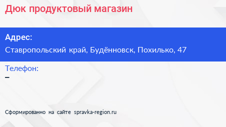 Дюк, продуктовый магазин по адресу Ставропольский край, Будённовск, Похилько, 47 в дальнейшем Организация, размещена в следующих категориях: