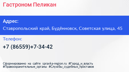 Гастроном Пеликан по адресу Ставропольский край, Будённовск, Советская улица, 45 в дальнейшем Организация, размещена в следующих категориях: