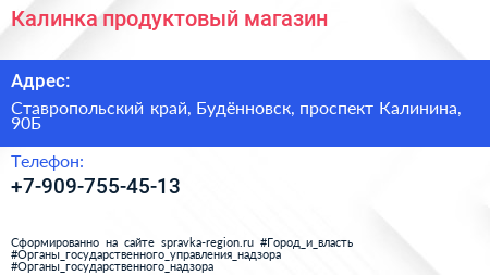 Калинка, продуктовый магазин по адресу Ставропольский край, Будённовск, проспект Калинина, 90Б в дальнейшем Организация, размещена в следующих категориях: