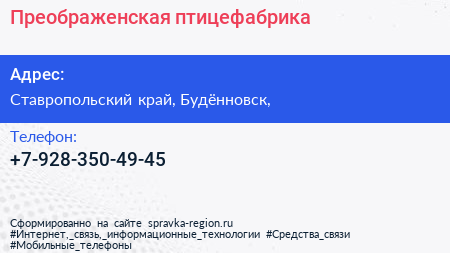 Преображенская, птицефабрика по адресу Ставропольский край, Будённовск, в дальнейшем Организация, размещена в следующих категориях: