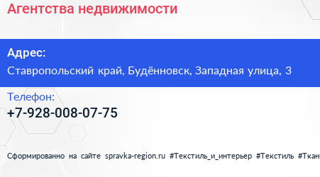 Агентства недвижимости по адресу Ставропольский край, Будённовск, Западная улица, 3 в дальнейшем Организация, размещена в следующих категориях: