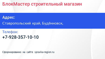 БлокМастер, строительный магазин по адресу Ставропольский край, Будённовск, в дальнейшем Организация, размещена в следующих категориях: