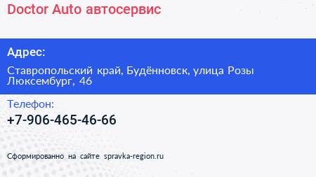 Doctor-Auto, автосервис по адресу Ставропольский край, Будённовск, улица Розы Люксембург, 46 в дальнейшем Организация, размещена в следующих категориях: