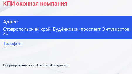 КПИ, оконная компания по адресу Ставропольский край, Будённовск, проспект Энтузиастов, 20 в дальнейшем Организация, размещена в следующих категориях: