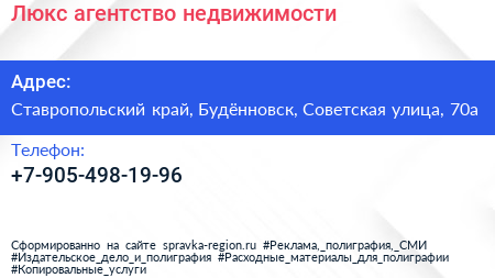 Люкс, агентство недвижимости по адресу Ставропольский край, Будённовск, Советская улица, 70а в дальнейшем Организация, размещена в следующих категориях: