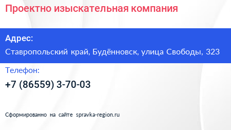 Проектно-изыскательная компания по адресу Ставропольский край, Будённовск, улица Свободы, 323 в дальнейшем Организация, размещена в следующих категориях: