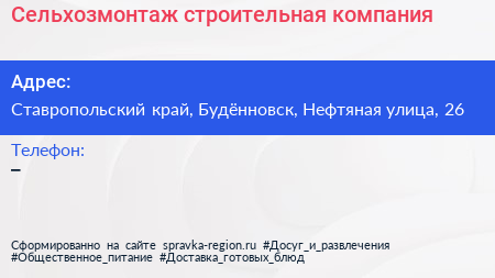 Сельхозмонтаж, строительная компания по адресу Ставропольский край, Будённовск, Нефтяная улица, 26 в дальнейшем Организация, размещена в следующих категориях: