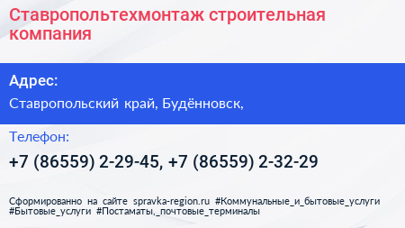 Ставропольтехмонтаж, строительная компания по адресу Ставропольский край, Будённовск, в дальнейшем Организация, размещена в следующих категориях: