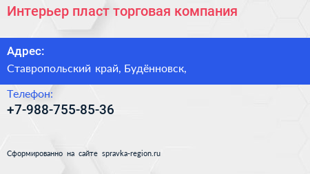Интерьер пласт, торговая компания по адресу Ставропольский край, Будённовск, в дальнейшем Организация, размещена в следующих категориях: