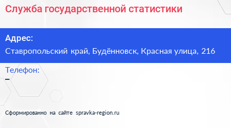 Служба государственной статистики по адресу Ставропольский край, Будённовск, Красная улица, 216 в дальнейшем Организация, размещена в следующих категориях: