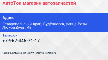 АвтоТок, магазин автозапчастей по адресу Ставропольский край, Будённовск, улица Розы Люксембург, 48 в дальнейшем Организация, размещена в следующих категориях: