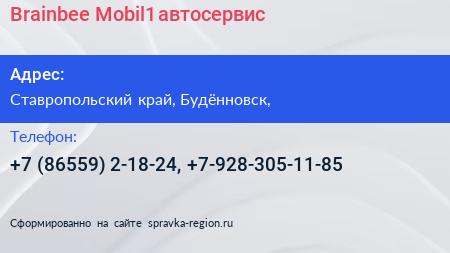Brainbee Mobil1, автосервис по адресу Ставропольский край, Будённовск, в дальнейшем Организация, размещена в следующих категориях: