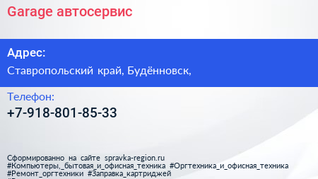 Garage, автосервис по адресу Ставропольский край, Будённовск, в дальнейшем Организация, размещена в следующих категориях: