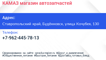 КАМАЗ, магазин автозапчастей по адресу Ставропольский край, Будённовск, улица Кочубея, 130 в дальнейшем Организация, размещена в следующих категориях: