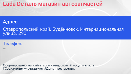 Lada Dеталь, магазин автозапчастей по адресу Ставропольский край, Будённовск, Интернациональная улица, 290 в дальнейшем Организация, размещена в следующих категориях: