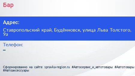 Бар по адресу Ставропольский край, Будённовск, улица Льва Толстого, 9а в дальнейшем Организация, размещена в следующих категориях: