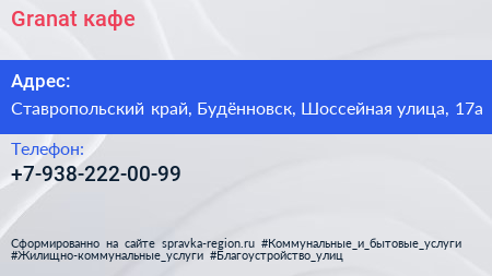 Granat, кафе по адресу Ставропольский край, Будённовск, Шоссейная улица, 17а в дальнейшем Организация, размещена в следующих категориях: