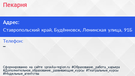 Пекарня по адресу Ставропольский край, Будённовск, Ленинская улица, 91Б в дальнейшем Организация, размещена в следующих категориях: