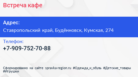 Встреча, кафе по адресу Ставропольский край, Будённовск, Кумская, 274 в дальнейшем Организация, размещена в следующих категориях: