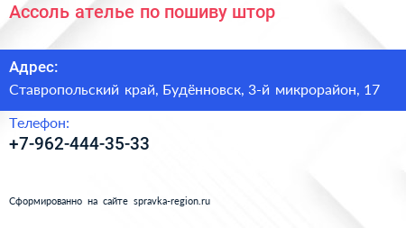 Ассоль, ателье по пошиву штор по адресу Ставропольский край, Будённовск, 3-й микрорайон, 17 в дальнейшем Организация, размещена в следующих категориях: