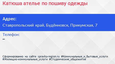 Катюша, ателье по пошиву одежды по адресу Ставропольский край, Будённовск, Прикумская, 7 в дальнейшем Организация, размещена в следующих категориях: