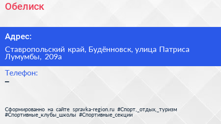 Обелиск по адресу Ставропольский край, Будённовск, улица Патриса Лумумбы, 209а в дальнейшем Организация, размещена в следующих категориях: