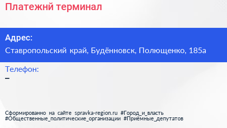 Платежнй терминал по адресу Ставропольский край, Будённовск, Полющенко, 185а в дальнейшем Организация, размещена в следующих категориях: