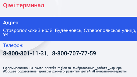 Qiwi, терминал по адресу Ставропольский край, Будённовск, Ставропольская улица, 94 в дальнейшем Организация, размещена в следующих категориях: