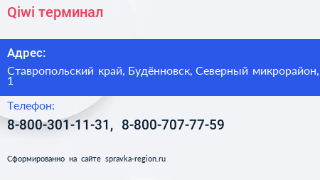 Qiwi, терминал по адресу Ставропольский край, Будённовск, Северный микрорайон, 1 в дальнейшем Организация, размещена в следующих категориях: