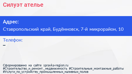 Силуэт, ателье по адресу Ставропольский край, Будённовск, 7-й микрорайон, 10 в дальнейшем Организация, размещена в следующих категориях: