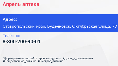 Апрель, аптека по адресу Ставропольский край, Будённовск, Октябрьская улица, 79 в дальнейшем Организация, размещена в следующих категориях: