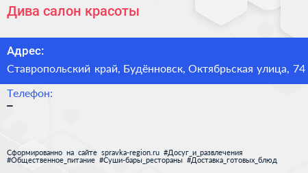 Дива, салон красоты по адресу Ставропольский край, Будённовск, Октябрьская улица, 74 в дальнейшем Организация, размещена в следующих категориях:
