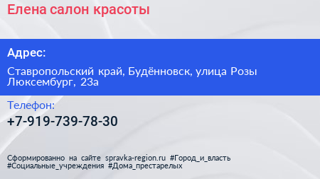 Елена, салон красоты по адресу Ставропольский край, Будённовск, улица Розы Люксембург, 23а в дальнейшем Организация, размещена в следующих категориях: