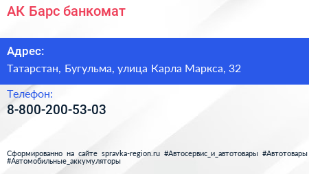 АК Барс, банкомат по адресу Татарстан, Бугульма, улица Карла Маркса, 32 в дальнейшем Организация, размещена в следующих категориях: