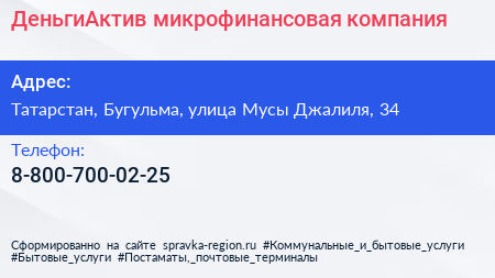 ДеньгиАктив, микрофинансовая компания по адресу Татарстан, Бугульма, улица Мусы Джалиля, 34 в дальнейшем Организация, размещена в следующих категориях: