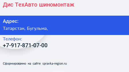 Дис-ТехАвто, шиномонтаж по адресу Татарстан, Бугульма, в дальнейшем Организация, размещена в следующих категориях: