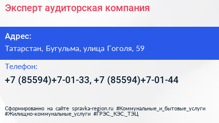 Эксперт, аудиторская компания по адресу Татарстан, Бугульма, улица Гоголя, 59 в дальнейшем Организация, размещена в следующих категориях: