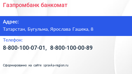 Газпромбанк, банкомат по адресу Татарстан, Бугульма, Ярослава Гашека, 8 в дальнейшем Организация, размещена в следующих категориях:
