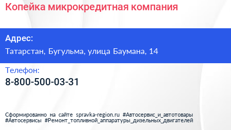 Копейка, микрокредитная компания по адресу Татарстан, Бугульма, улица Баумана, 14 в дальнейшем Организация, размещена в следующих категориях: